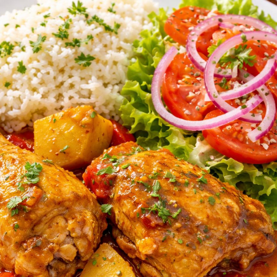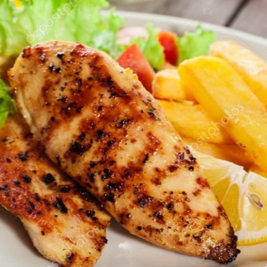 Pollo a la plancha con papas a la francesa, ensalada y salsa de tomate