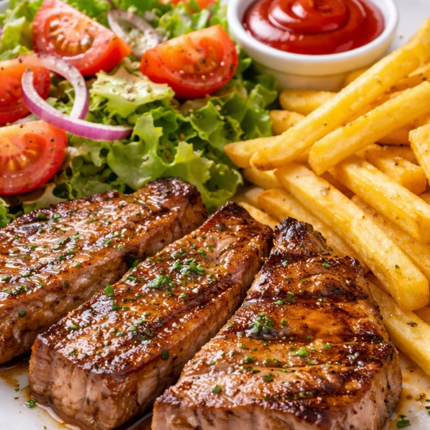 Chuleta de cerdo a la plancha con papas a la francesa, ensalada verde y salsa de tomate