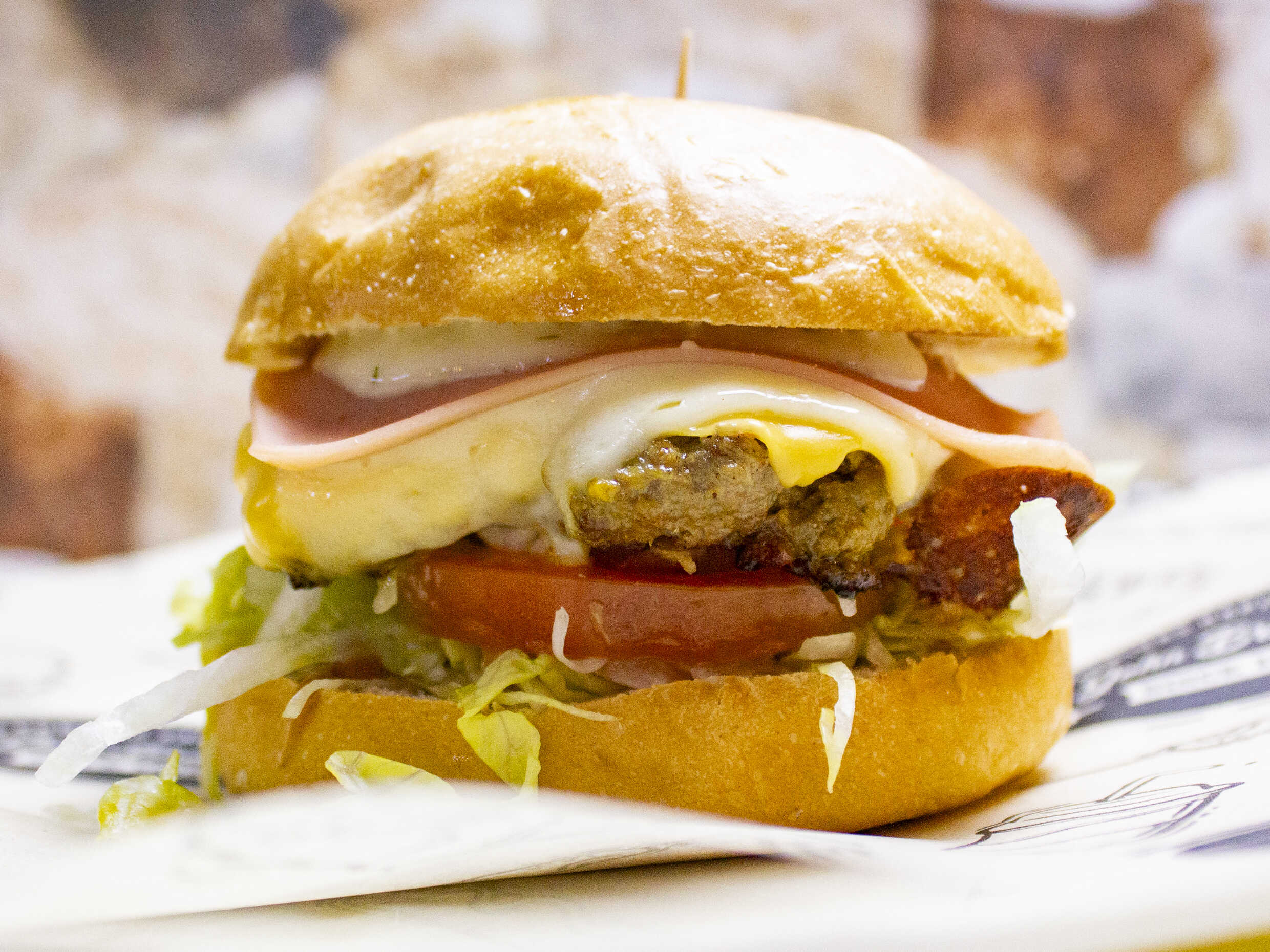 Pan artesanal, 150 g de carne de res, 150 g de pechuga de pollo, vegetales, queso mosarella, jamon y salsa de la casa.