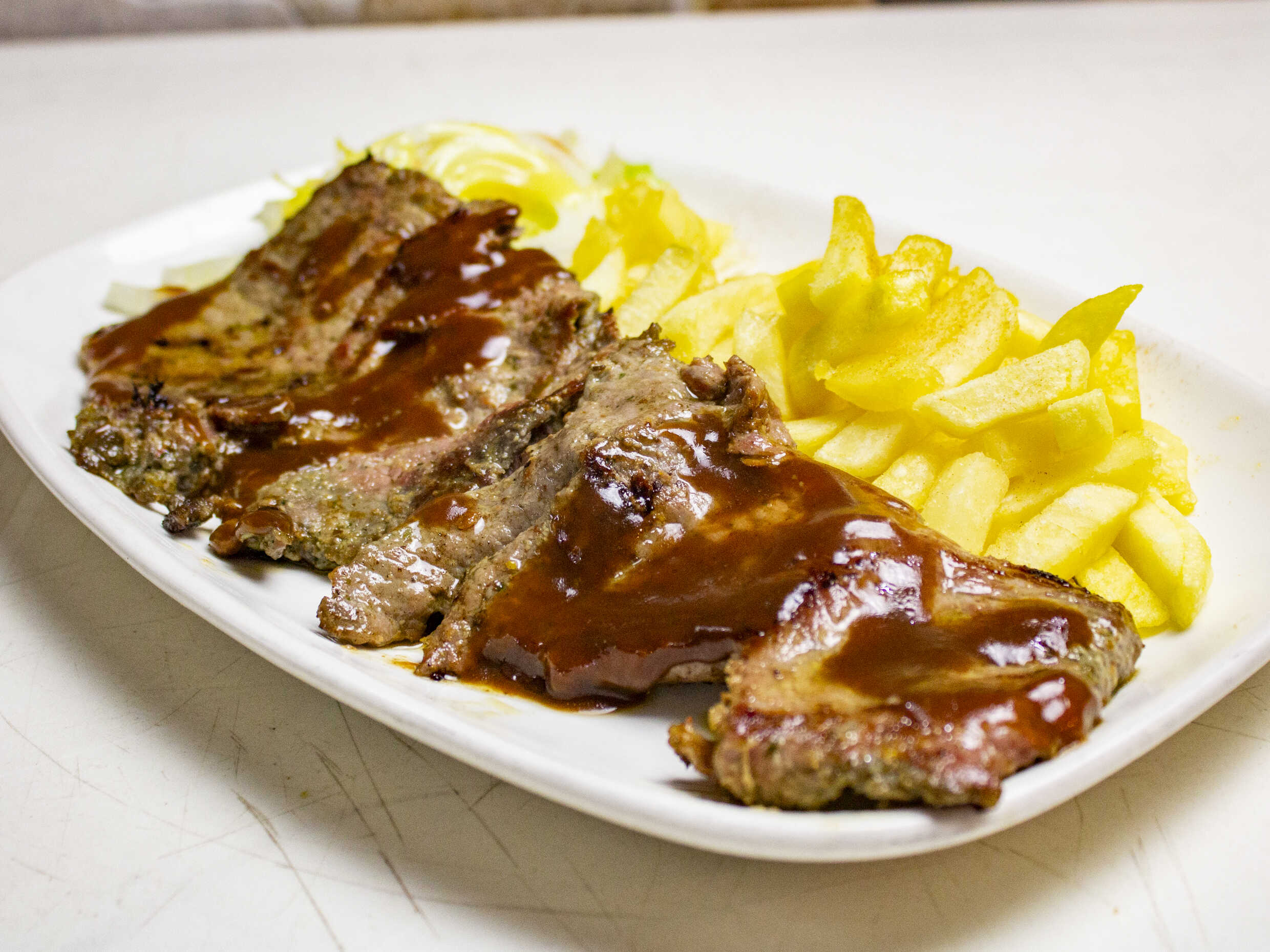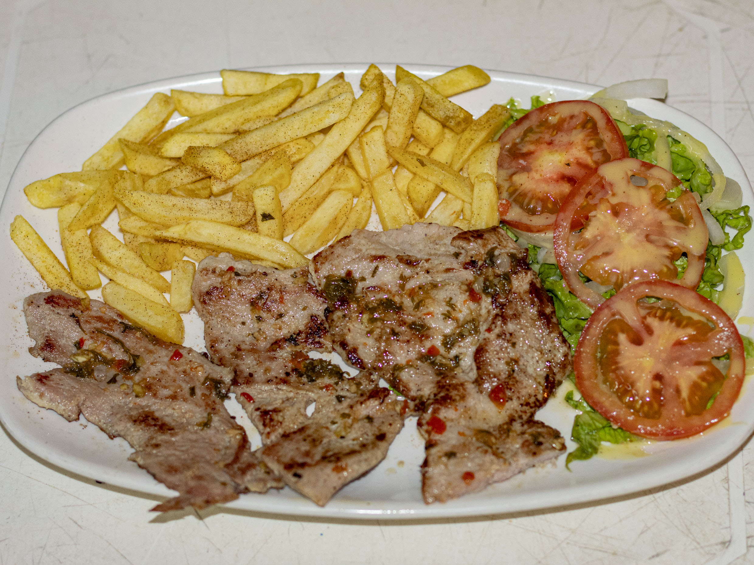 250 g De cerdo, papas a la francesa y ensalada de la casa.
