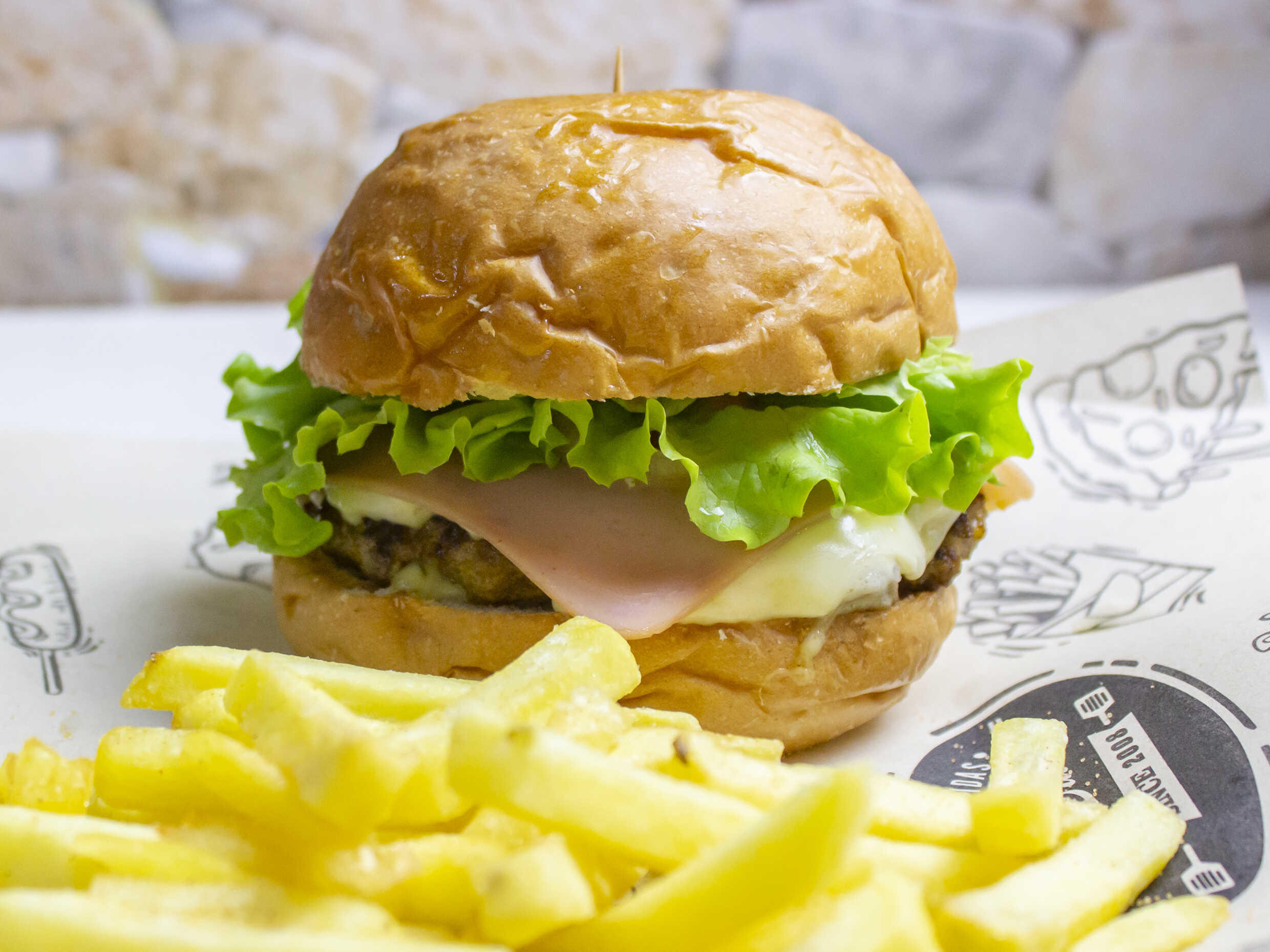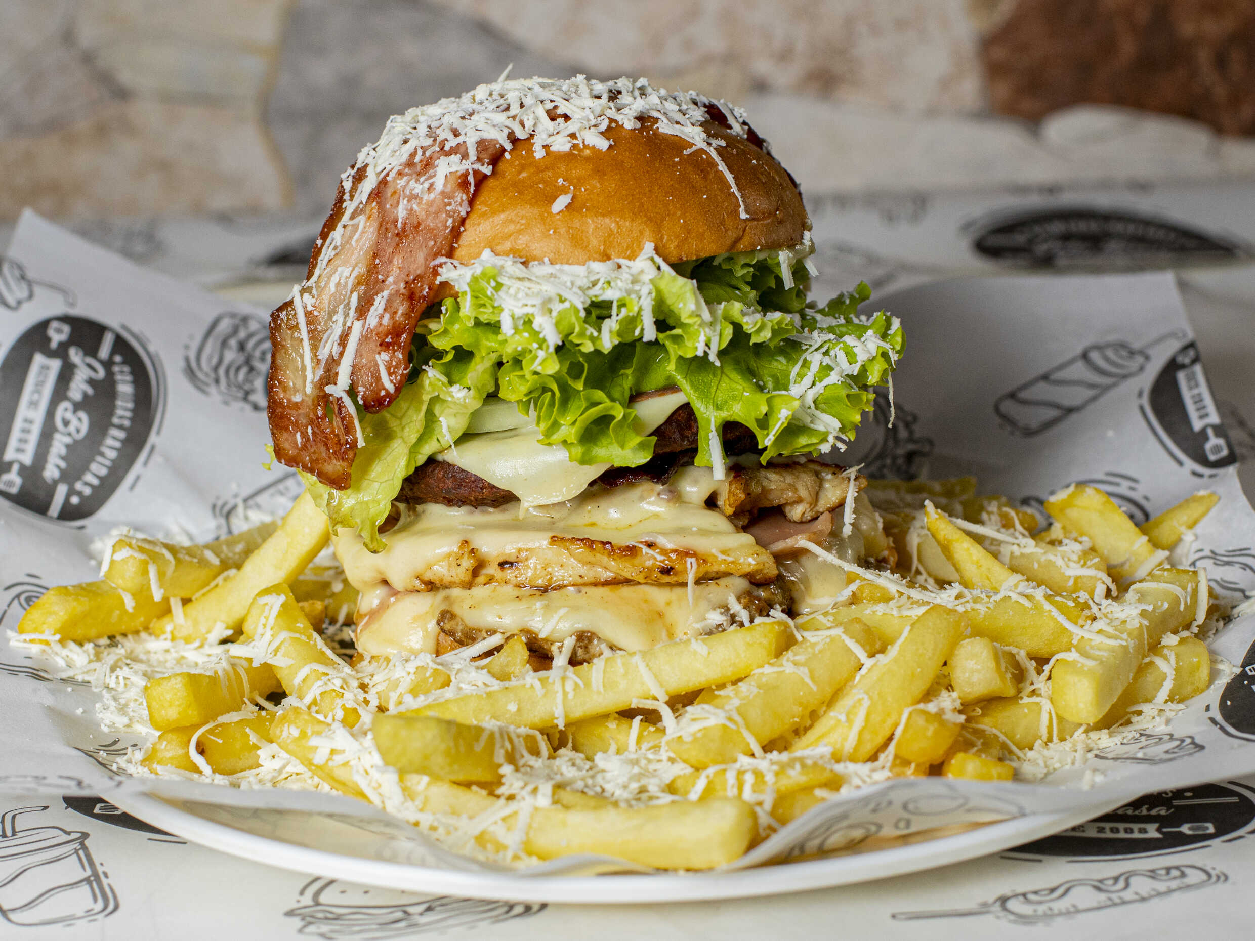 Pan artesanal, 150 g de carne de res, 150 g pechuga, 100 g carne ranchera, queso mosarella, jamon, tocineta, papas a la francesa, queso costeño y salsa de la casa.