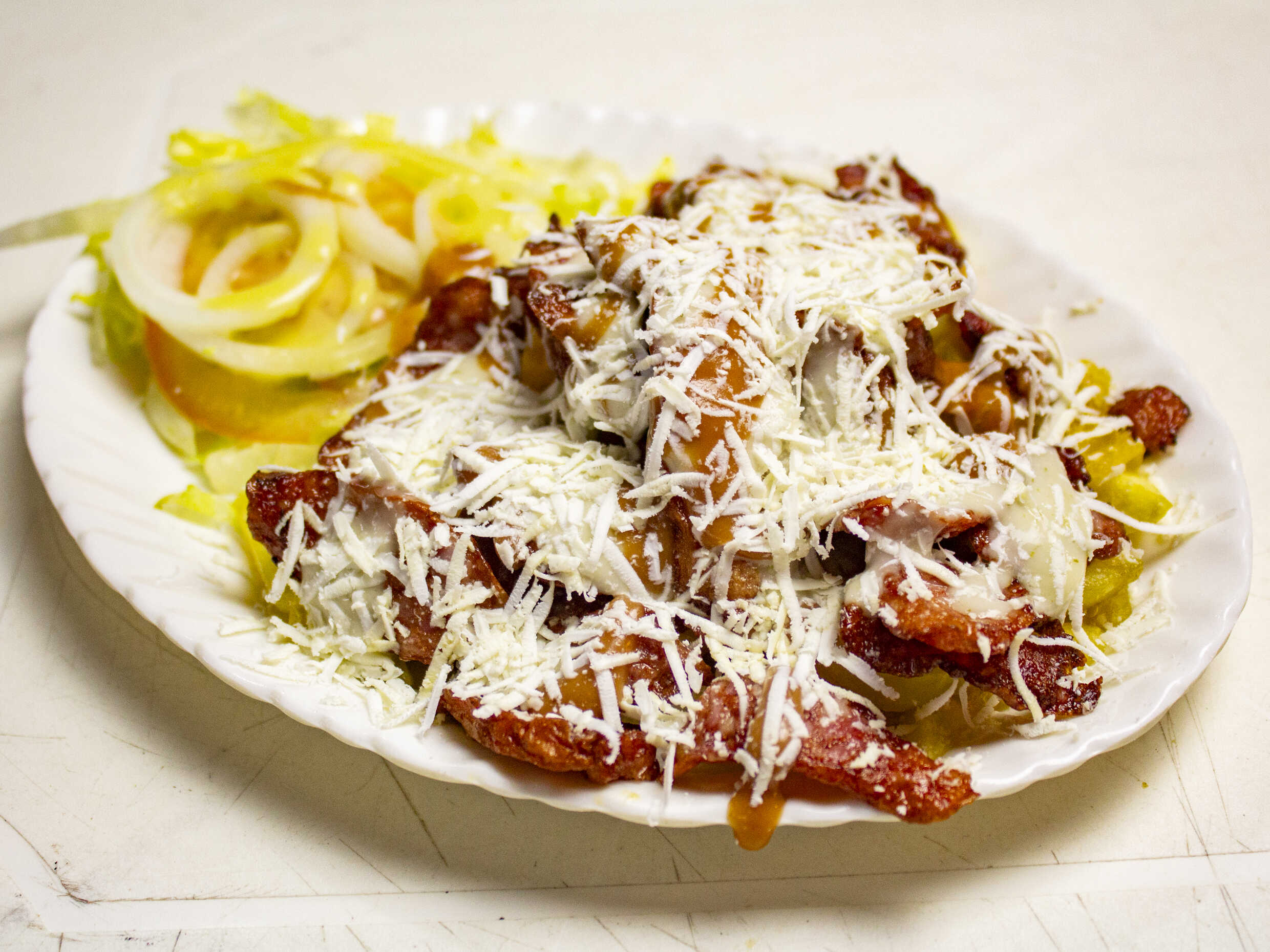 Papas francesas, pollo, carne, ensalada de la casa, queso mosarella y salsa de la casa.