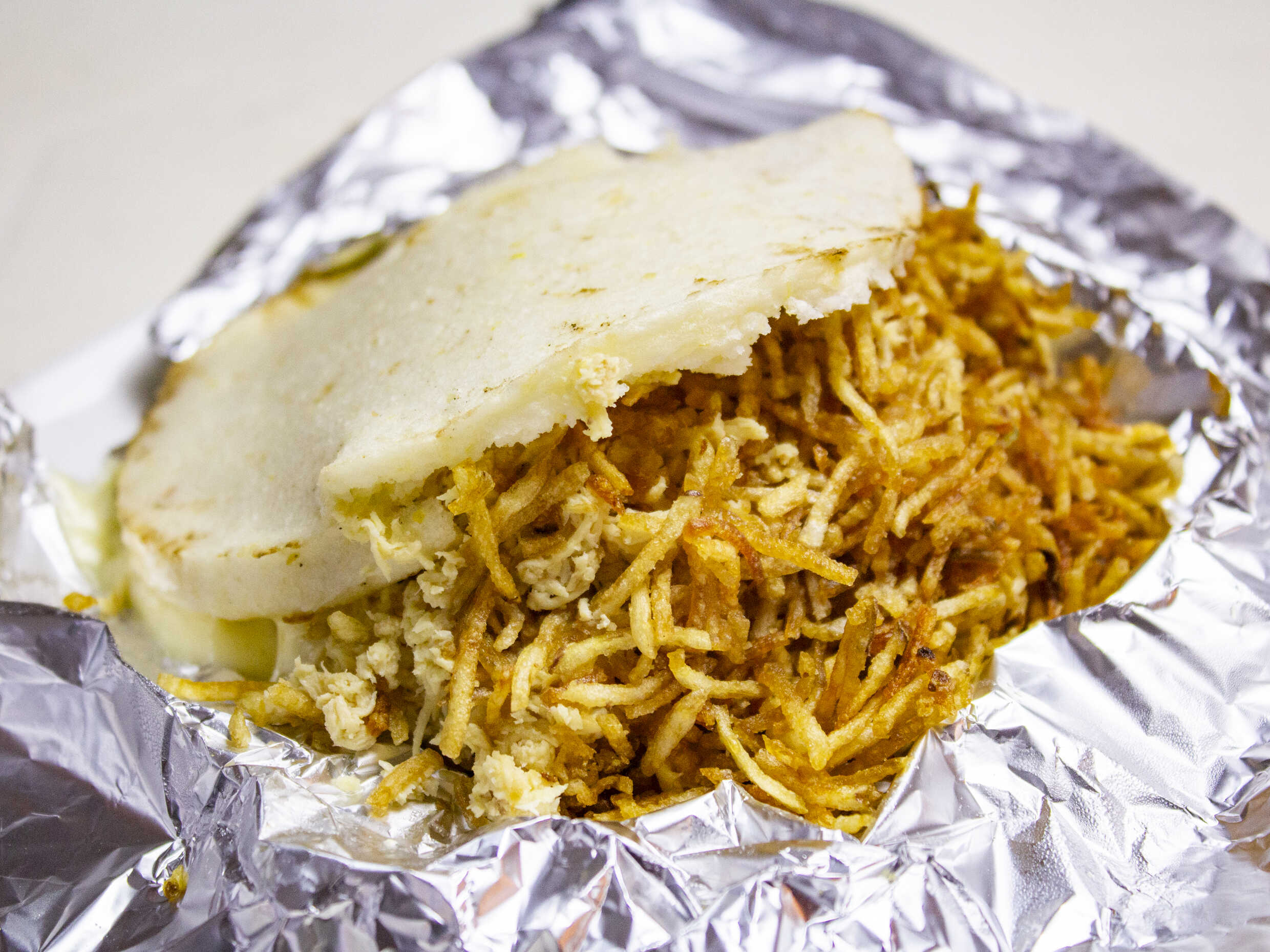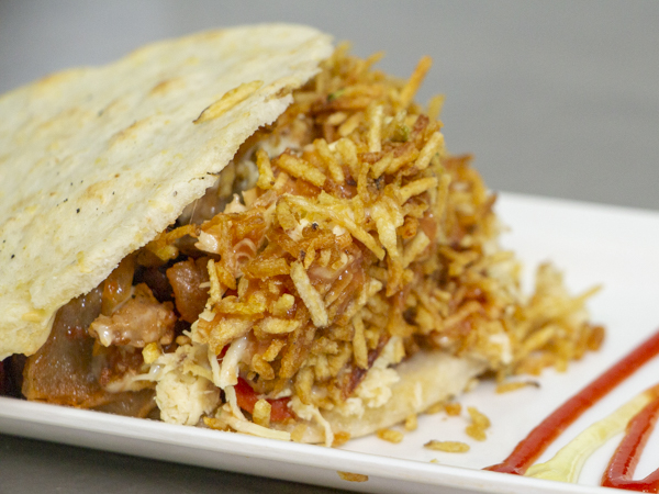 Arepa rellena con pollo, queso mosarella, papa ripio y salsas.