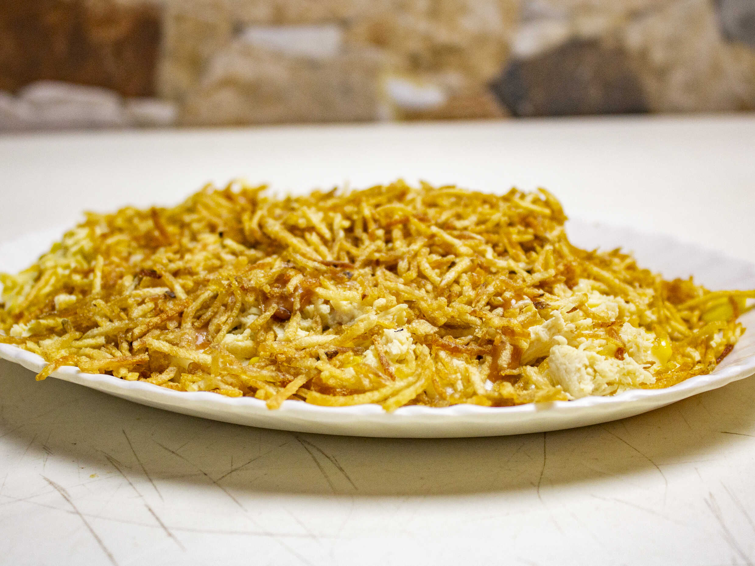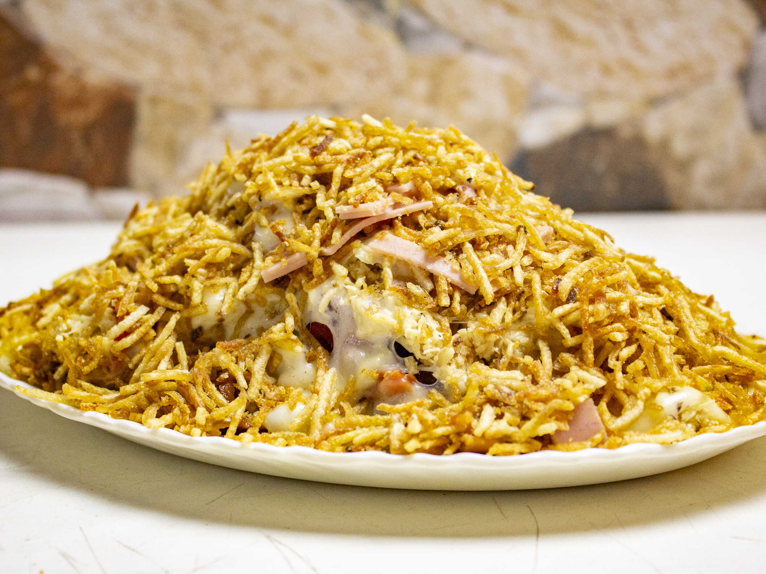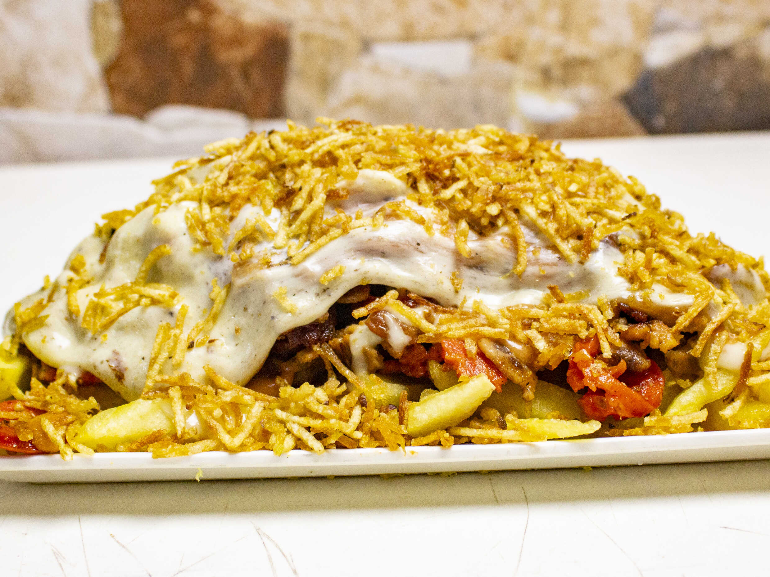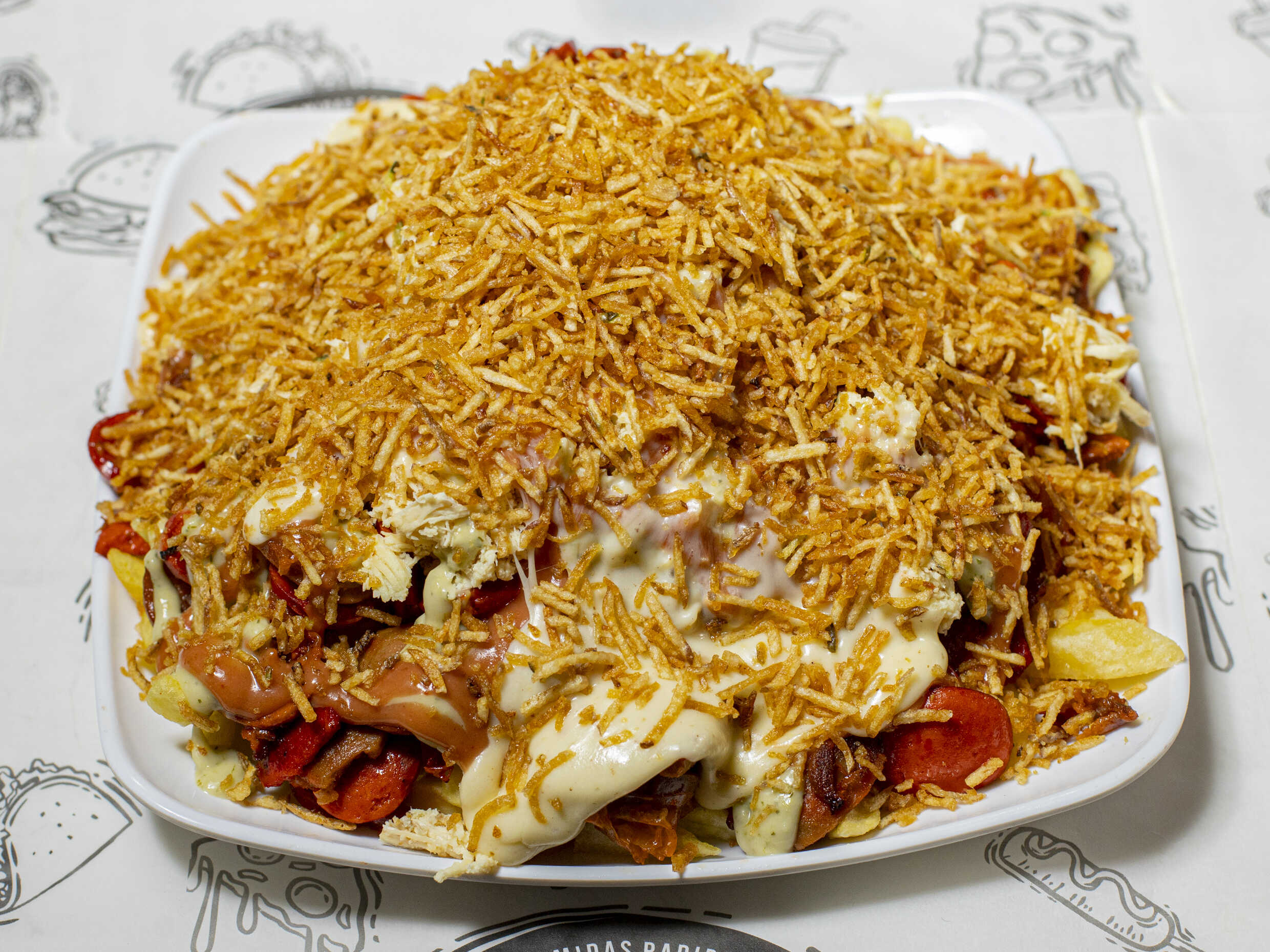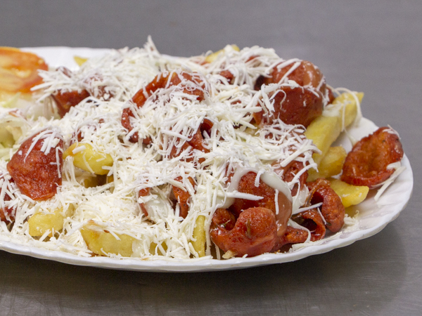 Papas francesas, pollo, chorizo, butifarra, chorizo, maíz, queso mosarella, salsa de la casa y papa ripio.