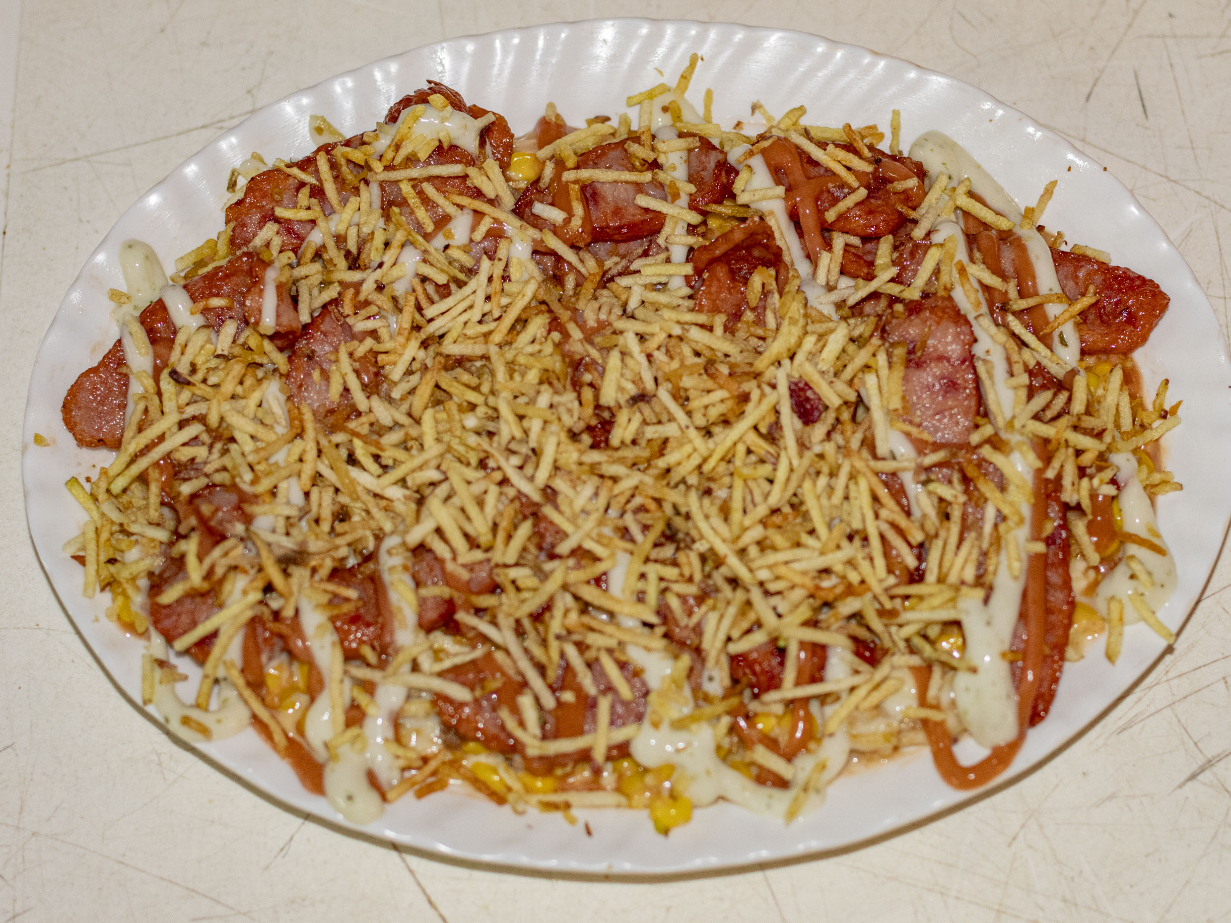 Maíz, salchicha Ranchera y queso mozzarella, salsa al gusto papá ripio