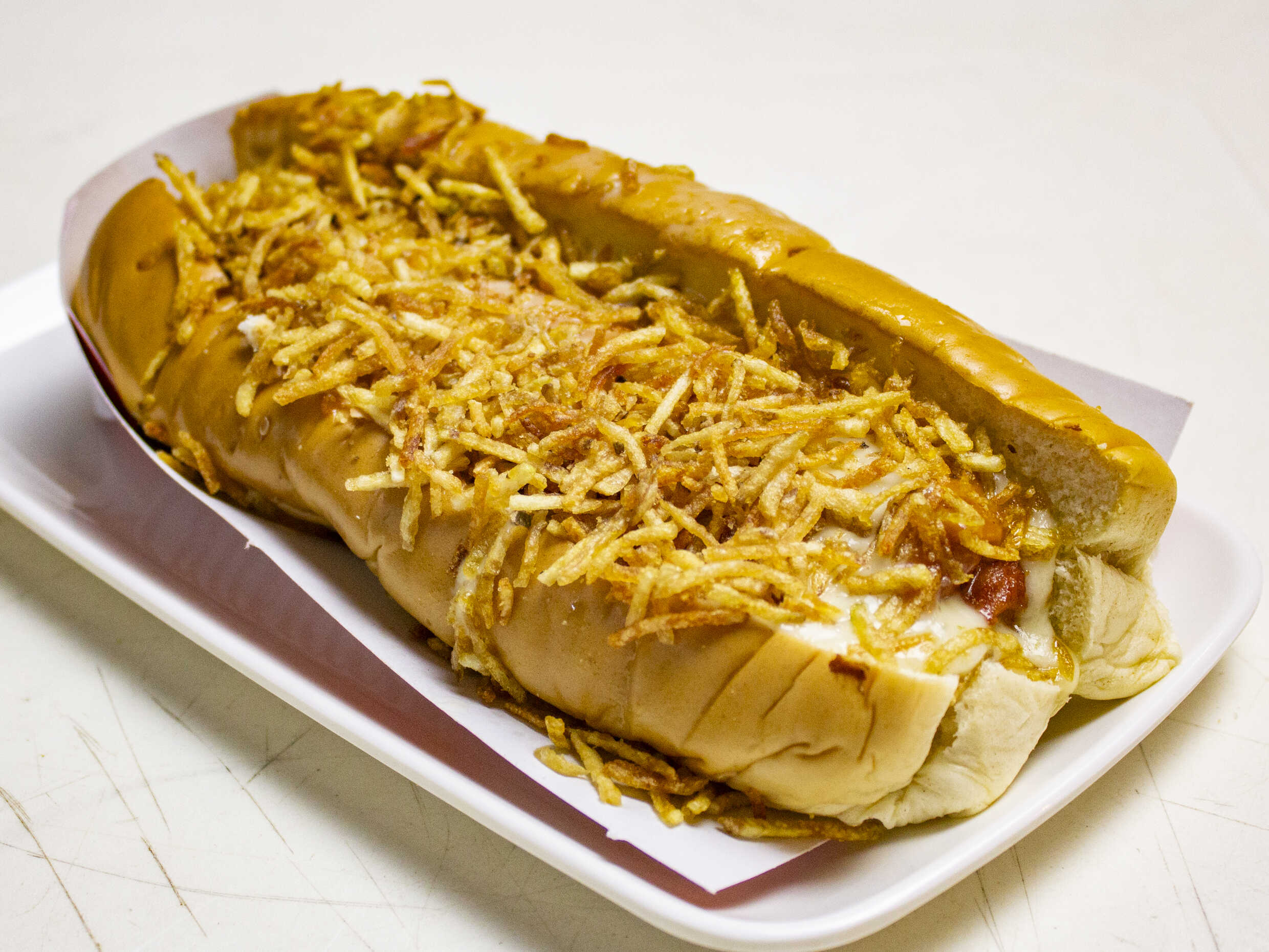 Pan super, chorizo, papa ripio, queso mosarella y salsa de la casa.