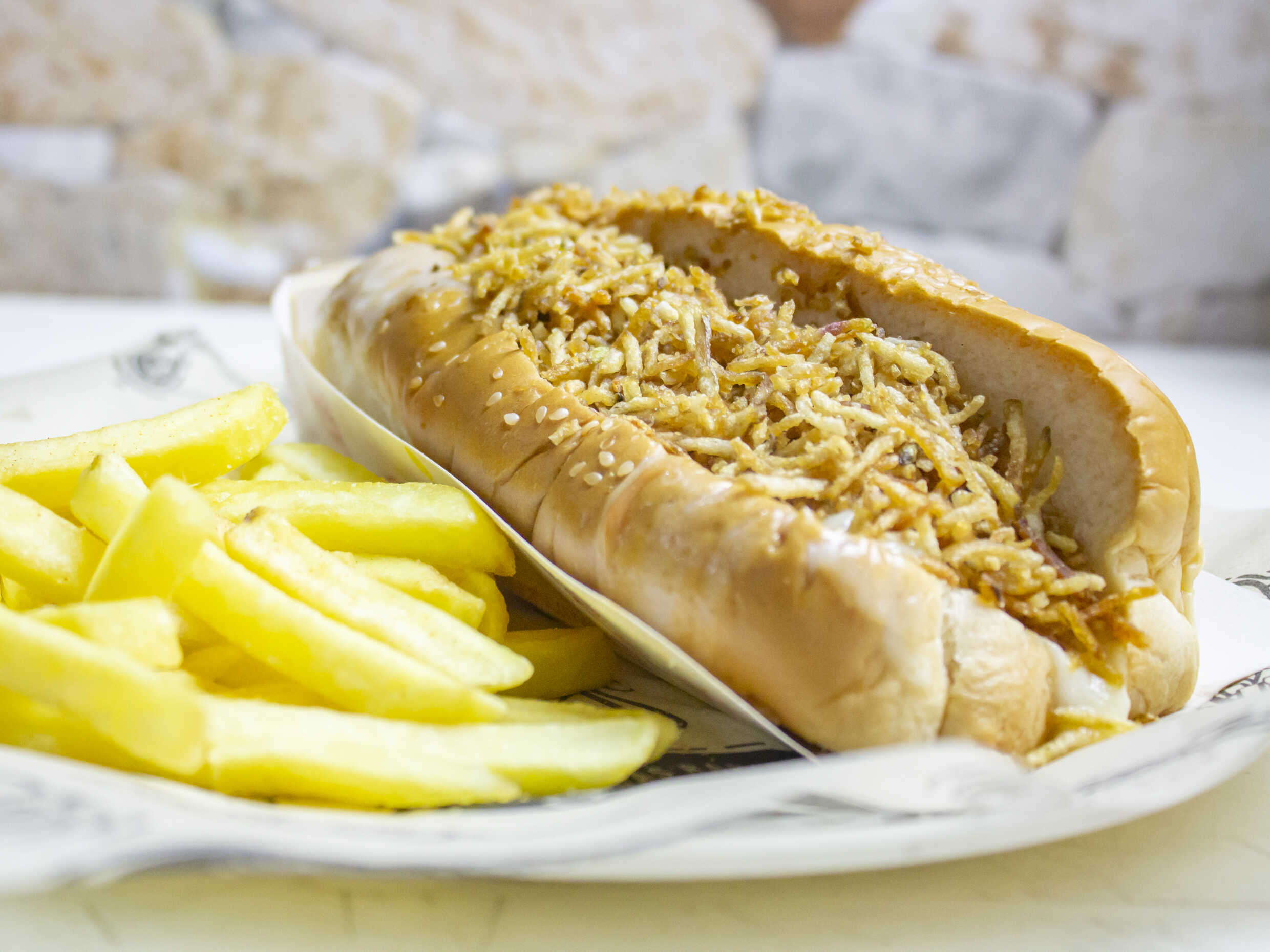 Salchicha tradicional, papas a la francesa, queso costeño y salsa de la casa.