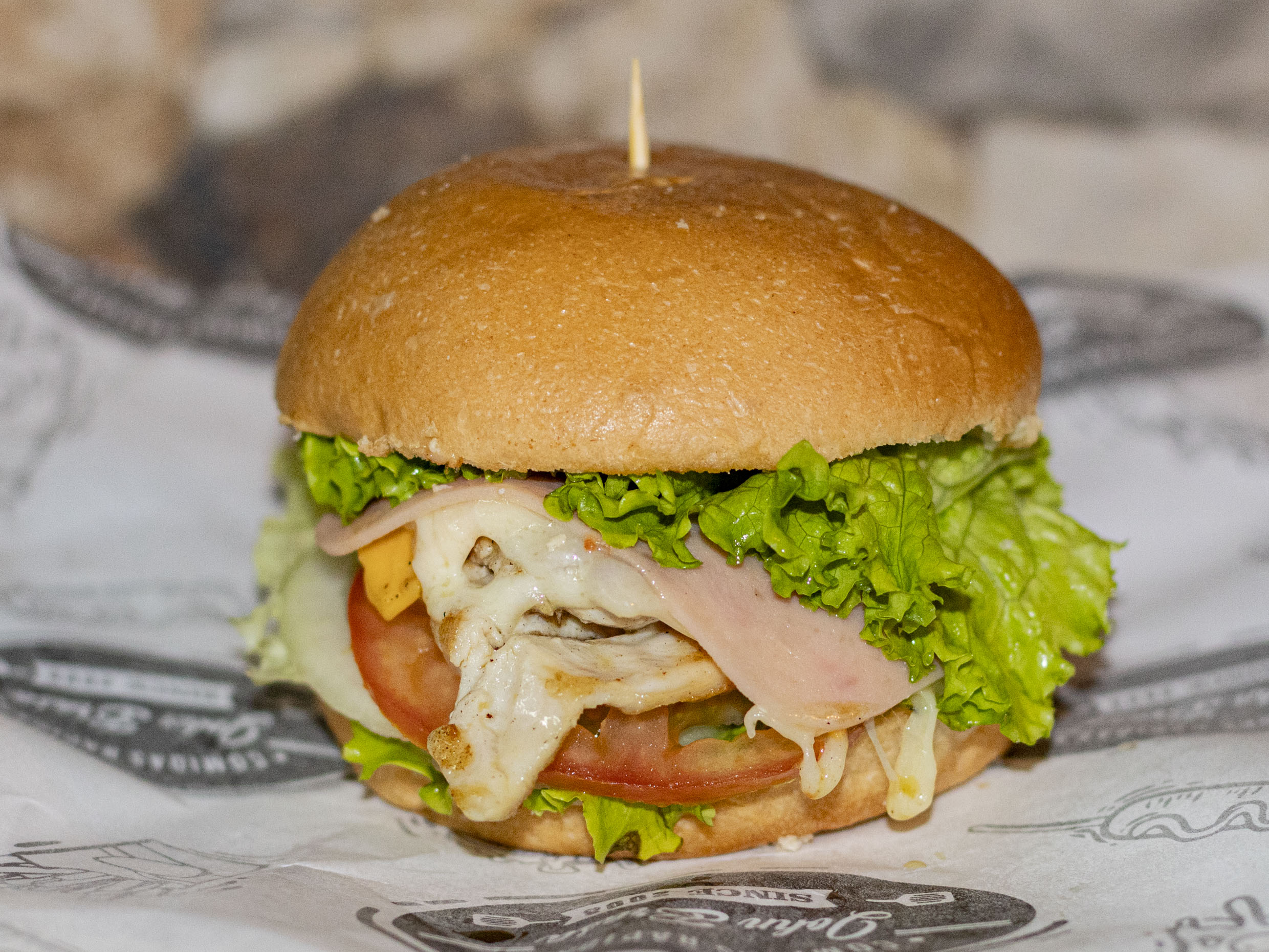 Pan artesanal, 150 g de pechuga de pollo, vegetales, queso mosarella, jamon y salsa de la casa.