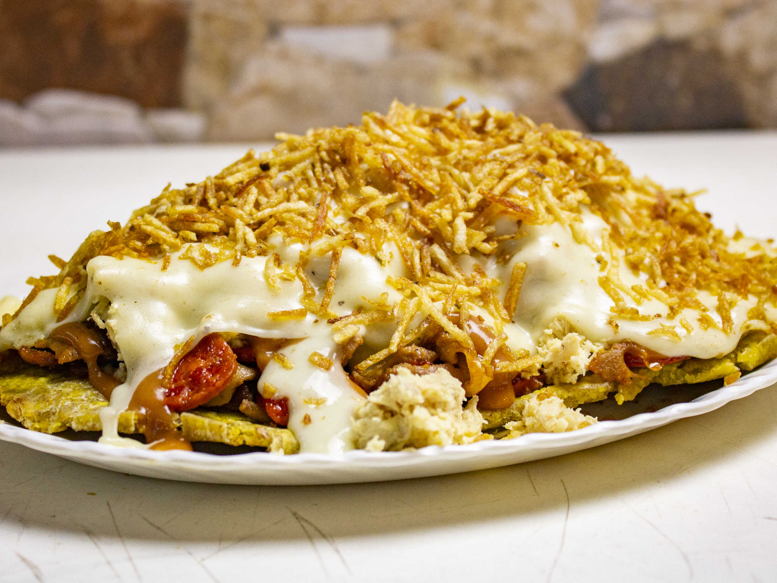 Patacón, chorizo, butifarra, pollo desmechado, papa ripio, queso mosarella y salsa de la casa.