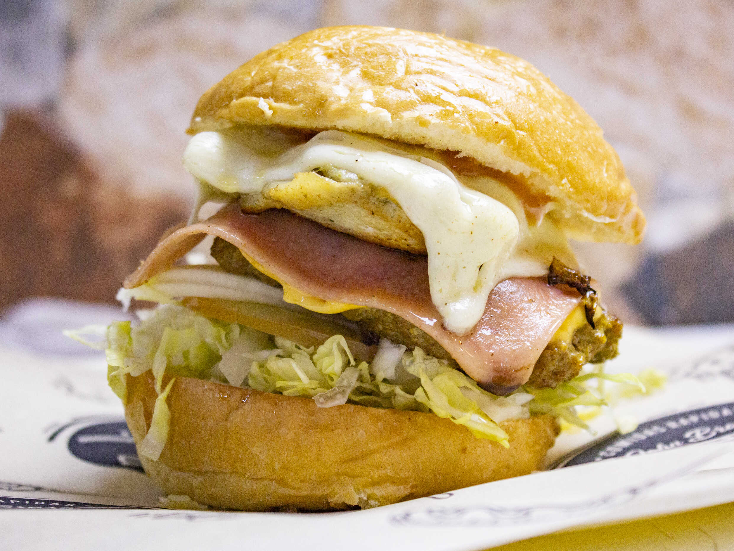 Pan super, carne de hamburguesa, jamón, pollo, queso mosarella, papa ripio y salsa de la casa.