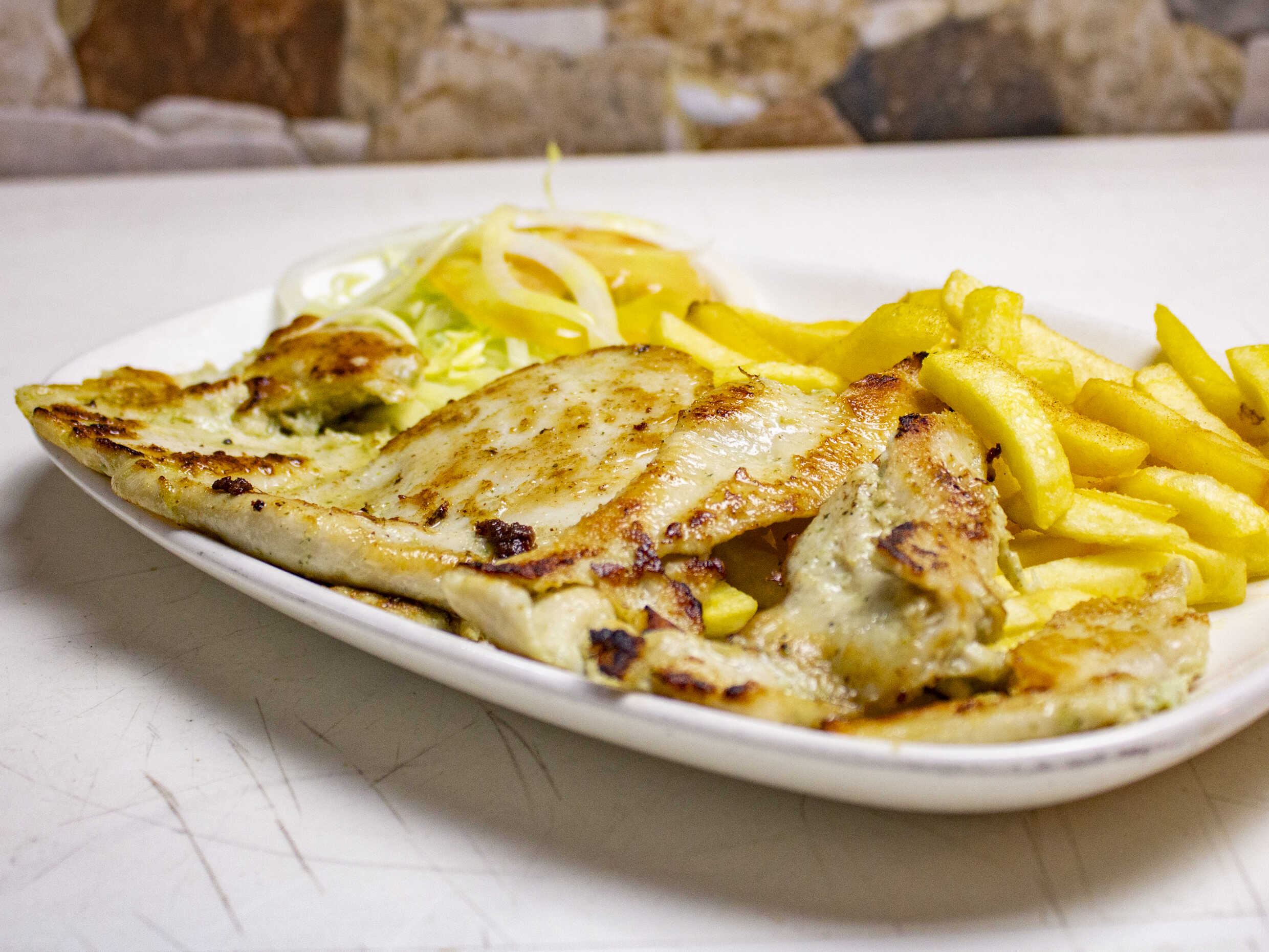 250 g De pechuga, papas a la francesa y ensalada de la casa.