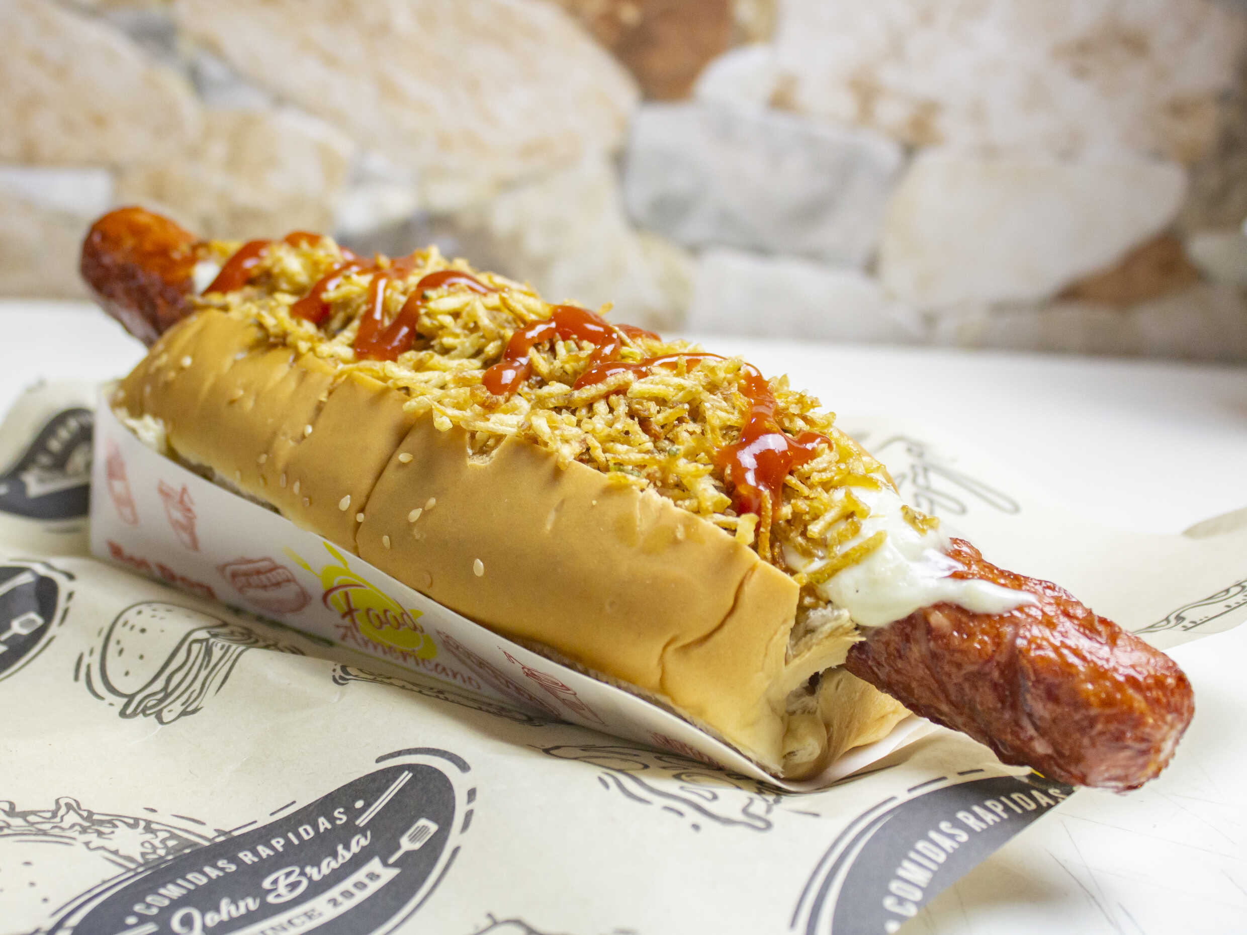 Pan super, salchicha super, papa ripio, queso mosarella y salsa de la casa.