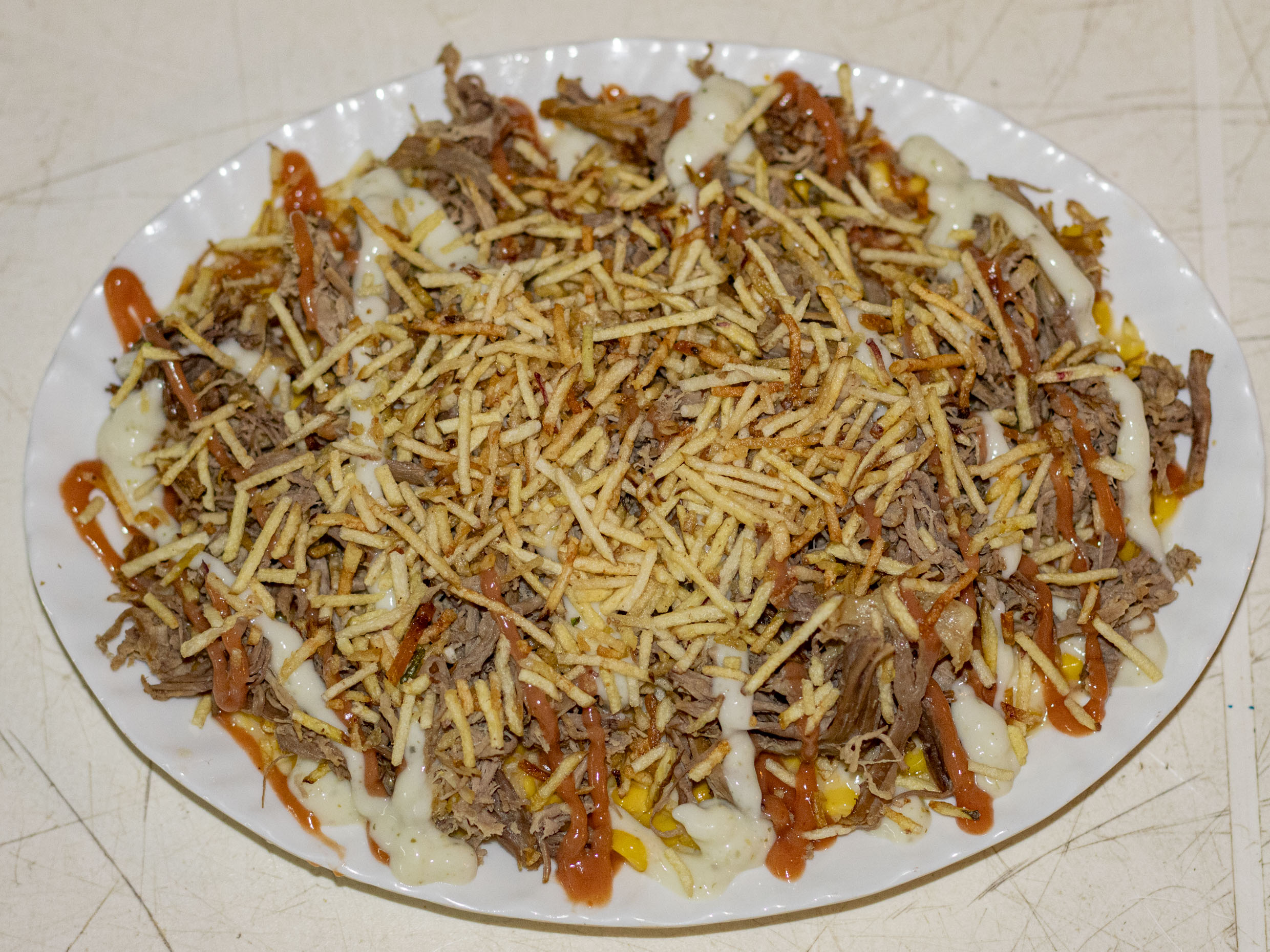 Maíz, carne desmechada, queso mosarella, salsa de la casa y papa ripio.