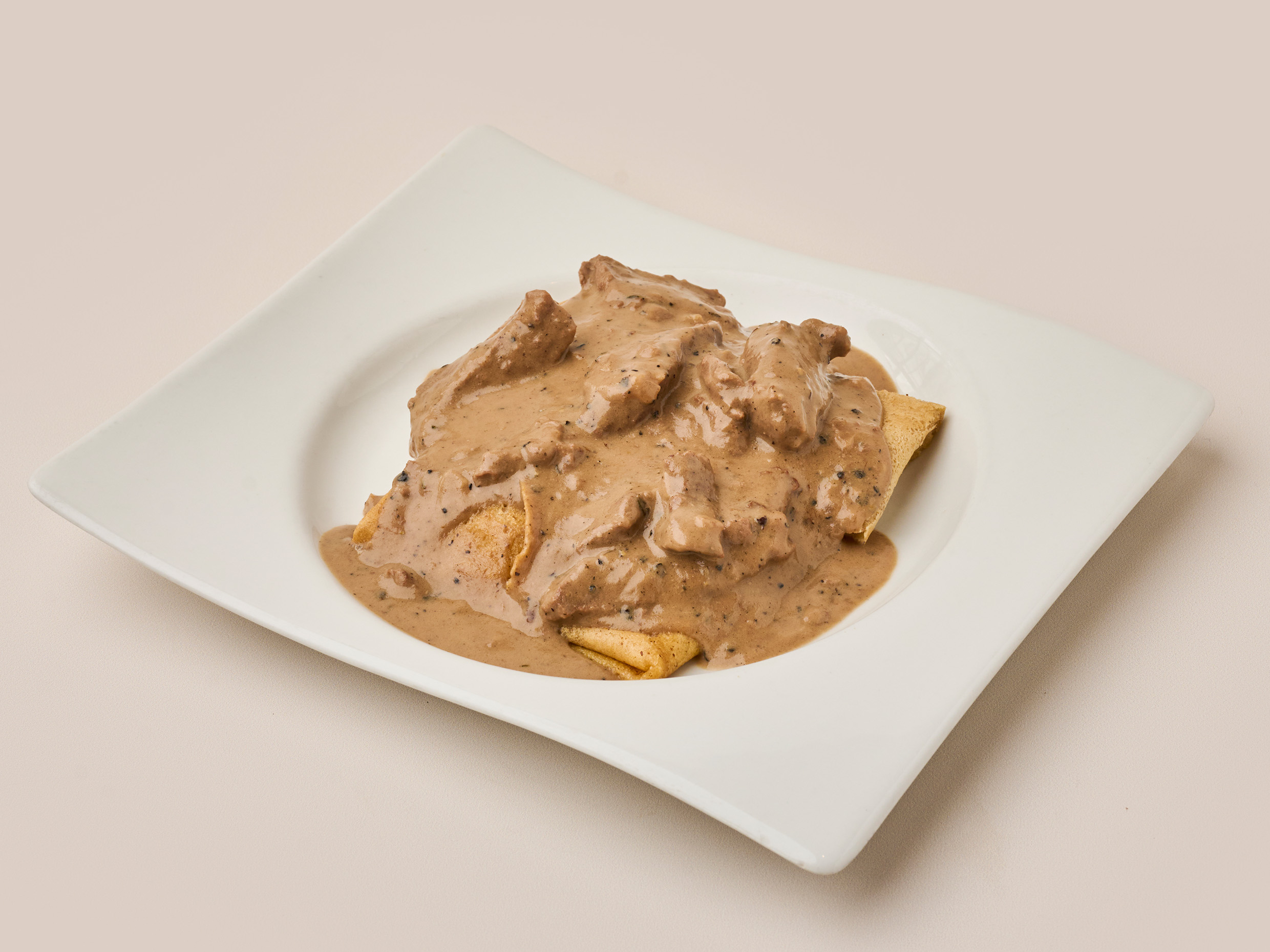 Crepe con carne desmechada, queso, huevo, crema agria y nuestro tradicional “hogao".