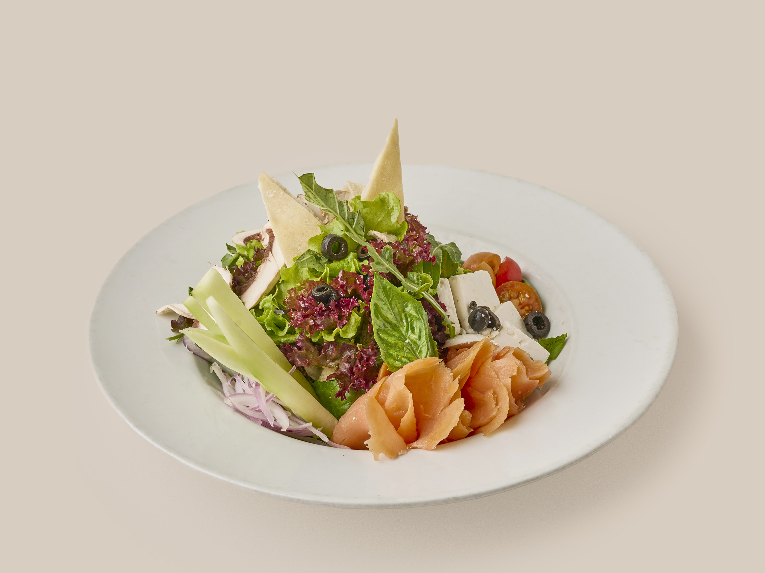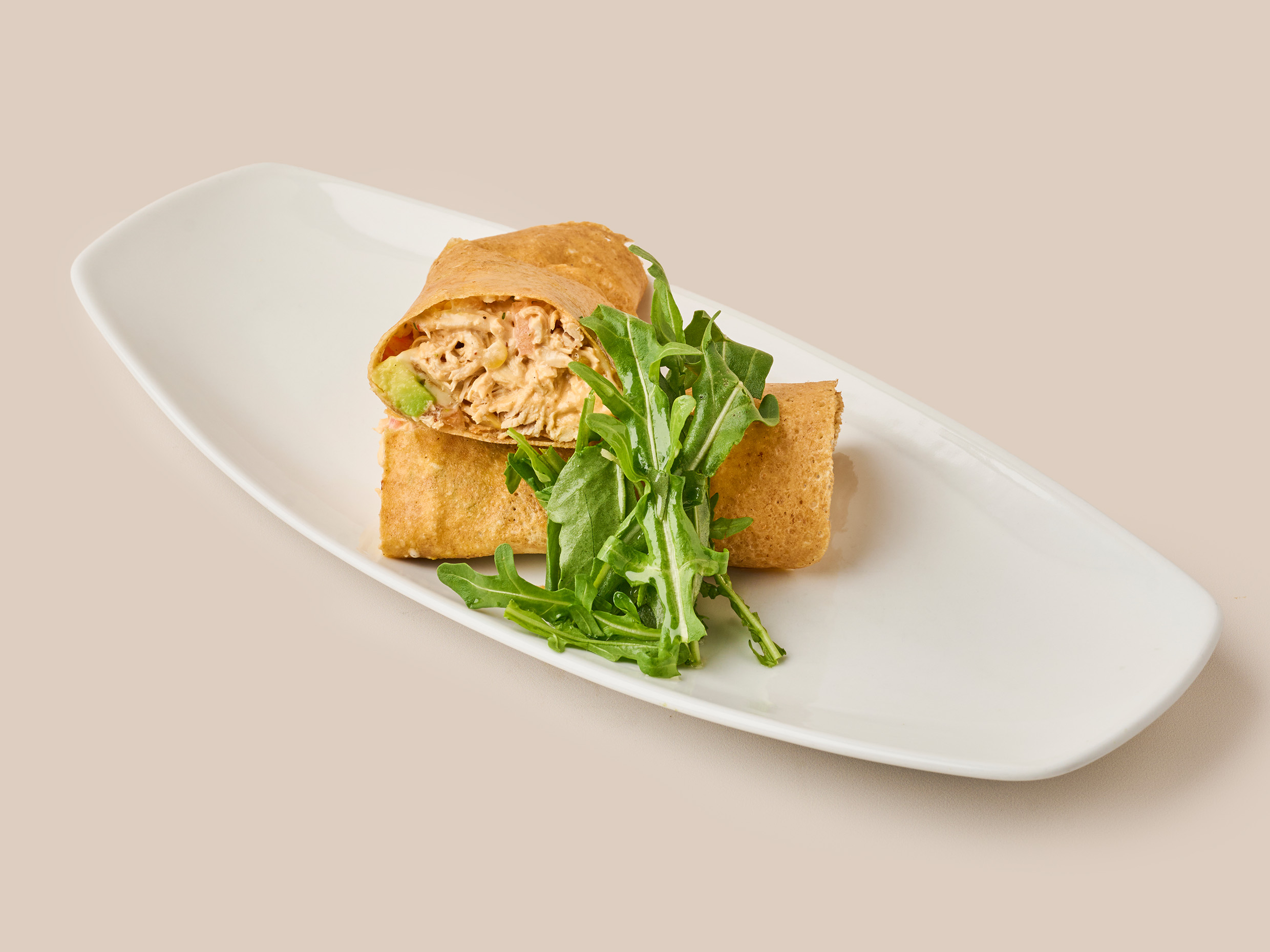Rollitos de salmón ahumado con rúgula, queso crema, mostaza, cebolla, aguacate y vegetales frescos. Acompañados de ensalada verde.