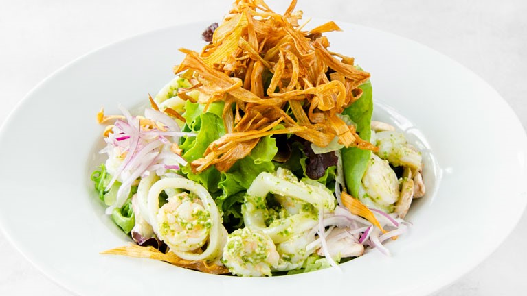 Camarones, calamares, pesto, variedad de lechugas frescas, apio, champiñones, cebolla roja, aceitunas negras, vinagre balsámico, aceite de oliva y cebollas crocantes.