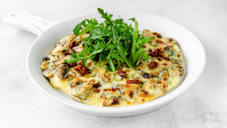 Pita con portobello y champiñones salteados con albahaca, tomates secos y rúgula, gratinados con queso.