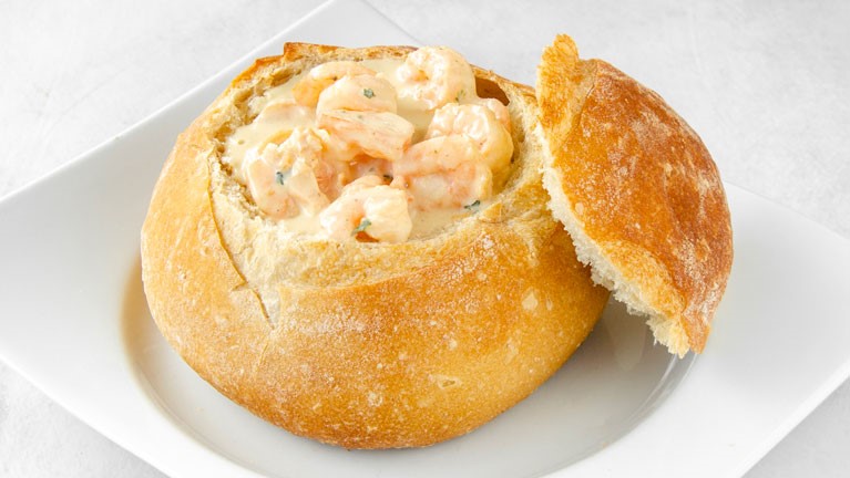 Panne Cook de pan artesanal con camarones en salsa al ajillo.