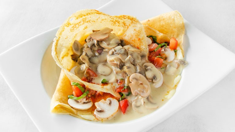 Crepe de champiñones bañados en una clásica salsa de quesos suizos.