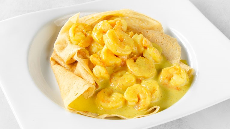 Crepe de camarones en nuestra salsa curry.