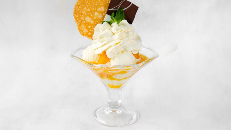 Helado de Vainilla y Yogurt de Maracuyá, melocotones, coulis de maracuyá, crema chantilly y crujiente galleta de encaje.
