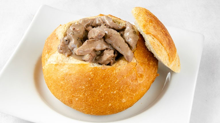 Panne Cook de pan artesanal con salsa de ternera y salsa de champiñones.
