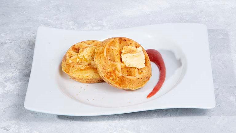 Dos mini waffles con mantequilla, panela orgánica molida y jalea de guayaba.