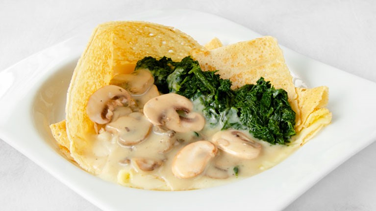 Crepe con espinaca y queso con clásica salsa de champiñones.