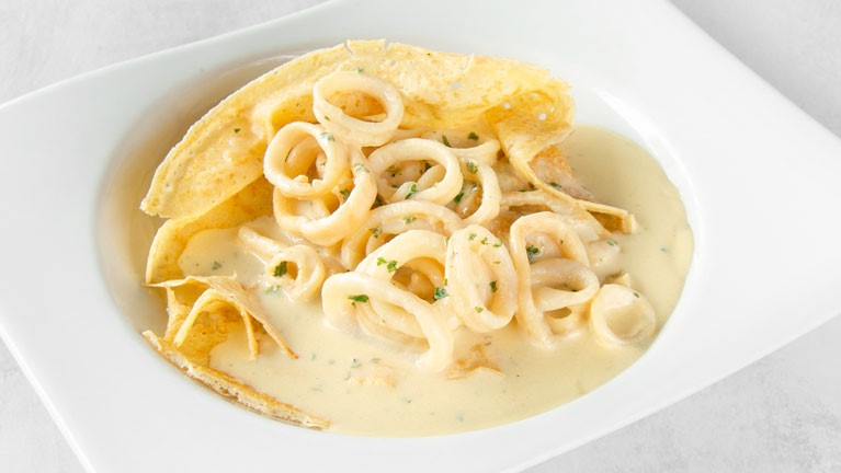 Crepe de calamares en nuestra salsa al ajillo.