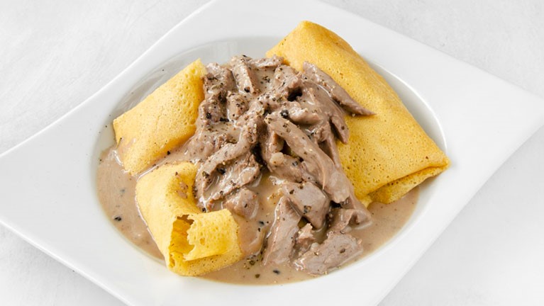 Crepe de lomo con baño en salsa de pimienta.