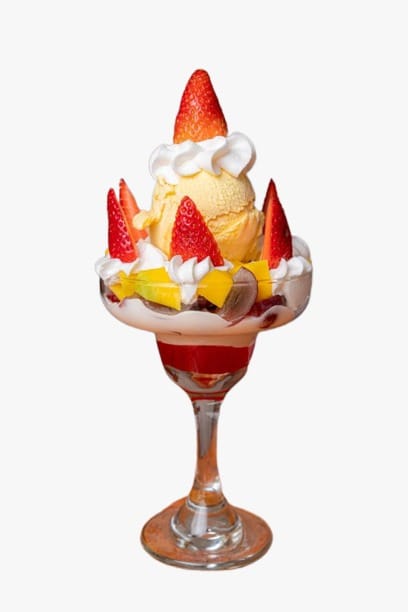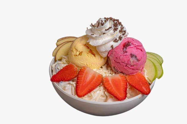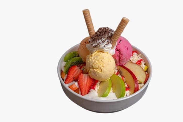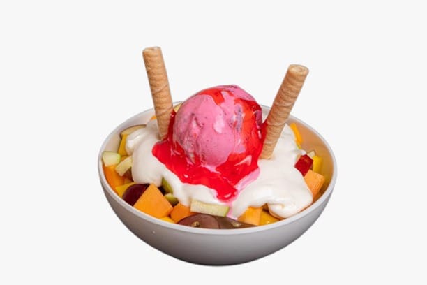 Melón, banano, uva, papaya, mango,1 porción de helado, crema de la casa, barquillo, salsa de fresa, chantilly.