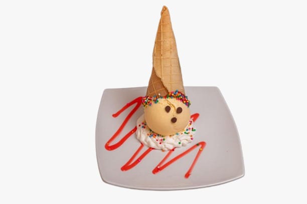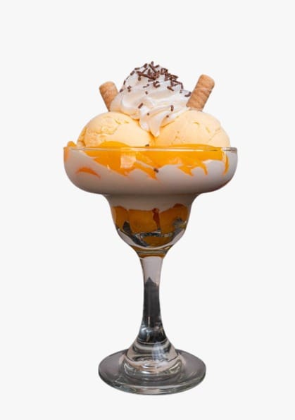 Durazno, dos porciones de helado, barquillo, crema de la casa, chantilly, lluvia de chocolate.