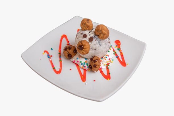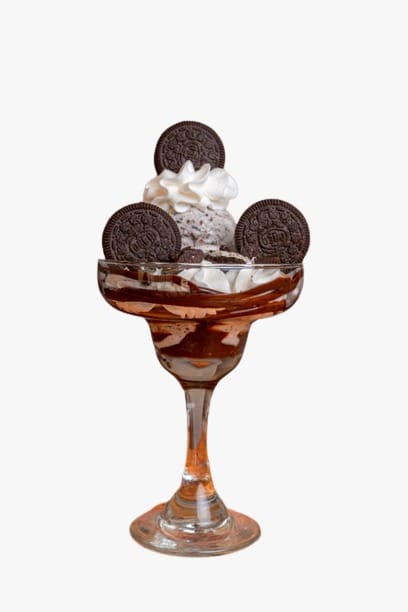 Galleta oreo, 2 porciones de helado, salsa de chocolate, chantilly