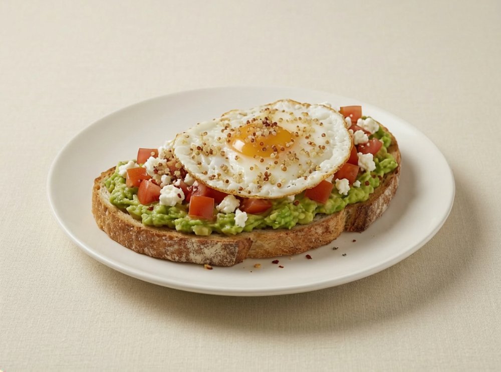 Tostada de pan de masa madre con puré de aguacate, huevo frito, tomate en cubos, quinoa crocante y queso feta.