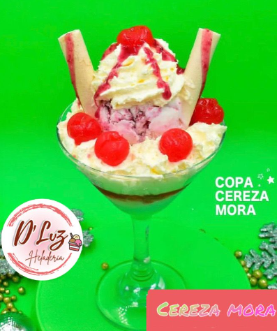 Copa de 2 sabores de helado, acompañado de cereza, barquillo, salsa de mora y crema de chantilly