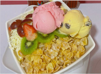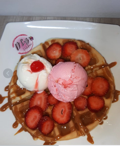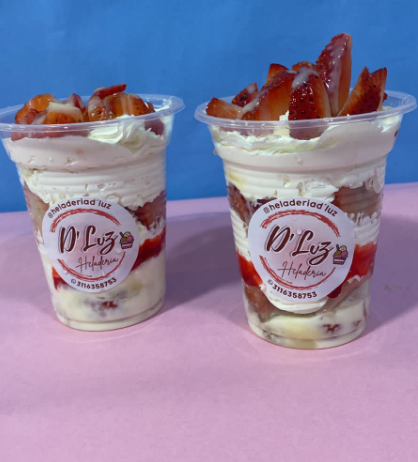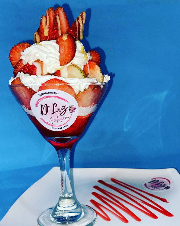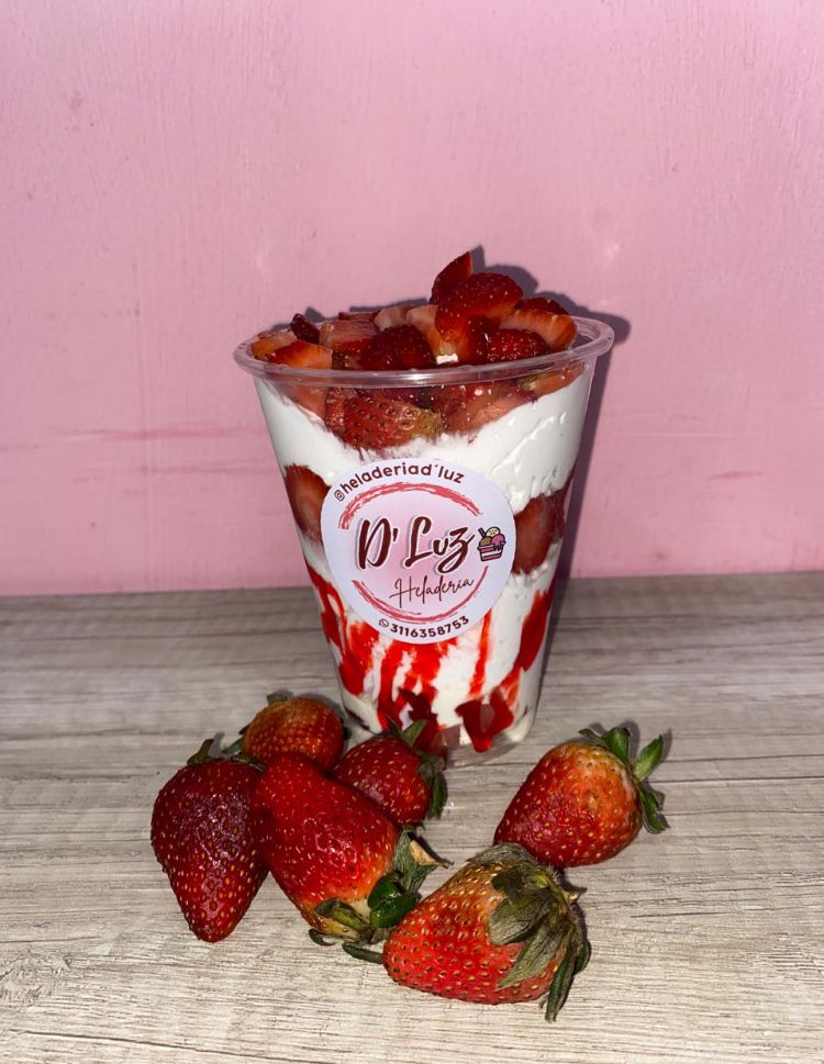 Exquisitas fresas bañadas en crema de leche, acompañada de dos sabores de helado, crema chantilly y leche condensada