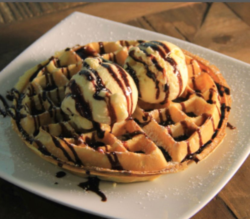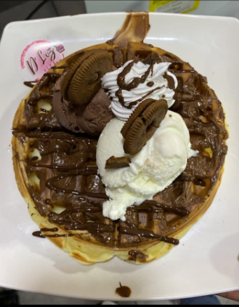Copa de 2 sabores de helado, acompañado de trozos de BROWNIE, salsa de chocolate, chantilly, barquillo.
