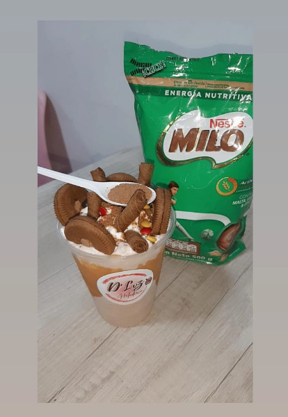 Deliciosa malteada de MILO acompañada de crema chantilly, barquillo, salsa de arequipe, galleta Milo y MILO en polvo