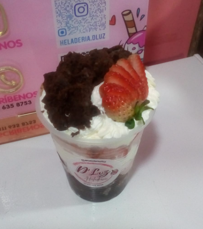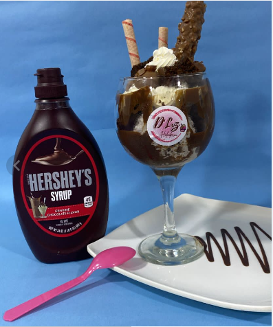 Copa de 3 sabores de helados, acompañado de trozos de BROWNIE,salsa HERSHEY'S, chocolatina, gol y crema chantilly.