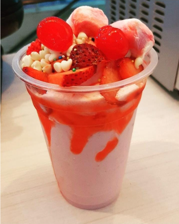Deliciosa malteada FRUTOS ROJOS acompañada de crema chantilly,fresas,cerezas,salsa de fresa y maní.