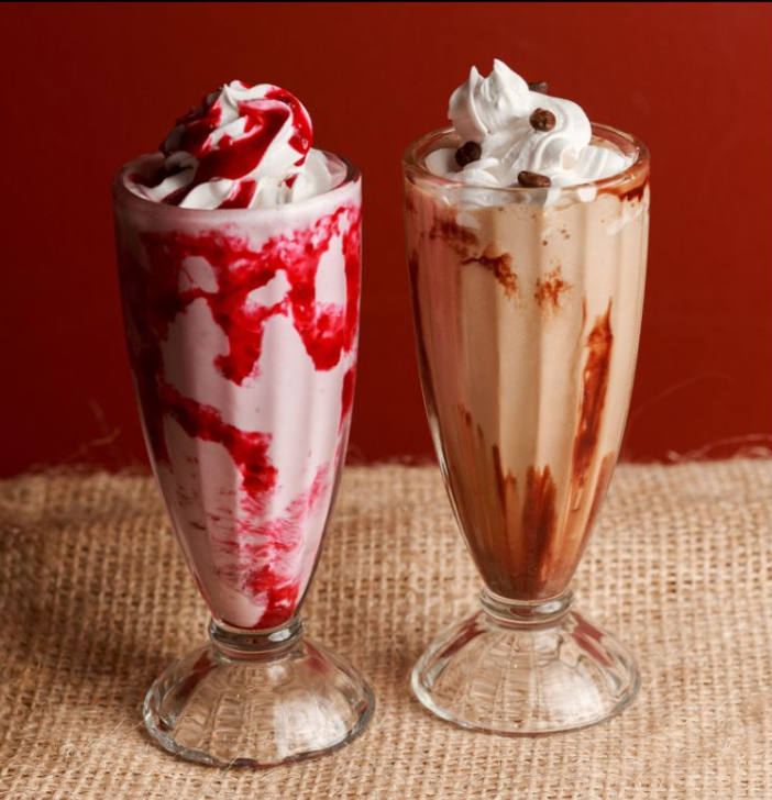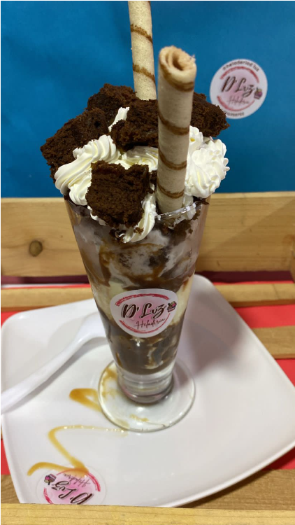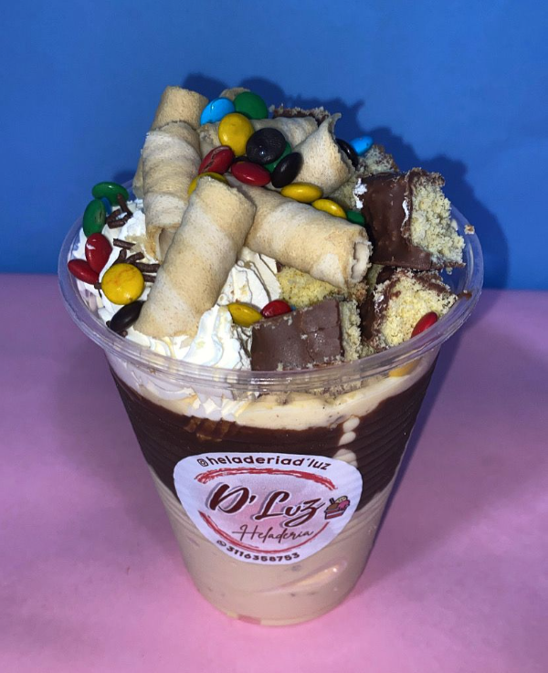 Malteadas y salsa a elección, acompañada de trozos de brownie, barquillo, m&m y crema chantilly.
