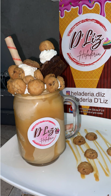 Deliciosa malteada MINICHIPS acompañada de crema chantilly, barquillo,salsa de arequipe, brownie y MINICHIPS