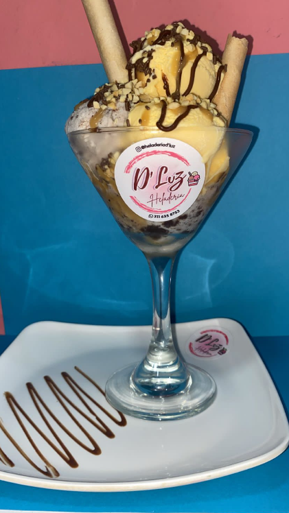 Copa con 5 sabores de helado,bañados en salsa de chocolate y arequipe, lluvia de chocolate, maní y barquillos.