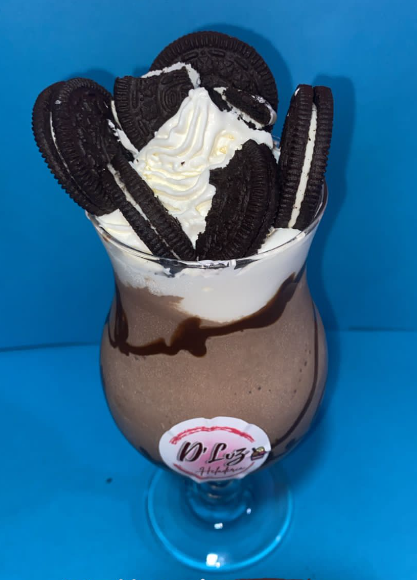 Deliciosa malteada de chocolate acompañada de salsa de chocolate, chantilly y galleta oreo.