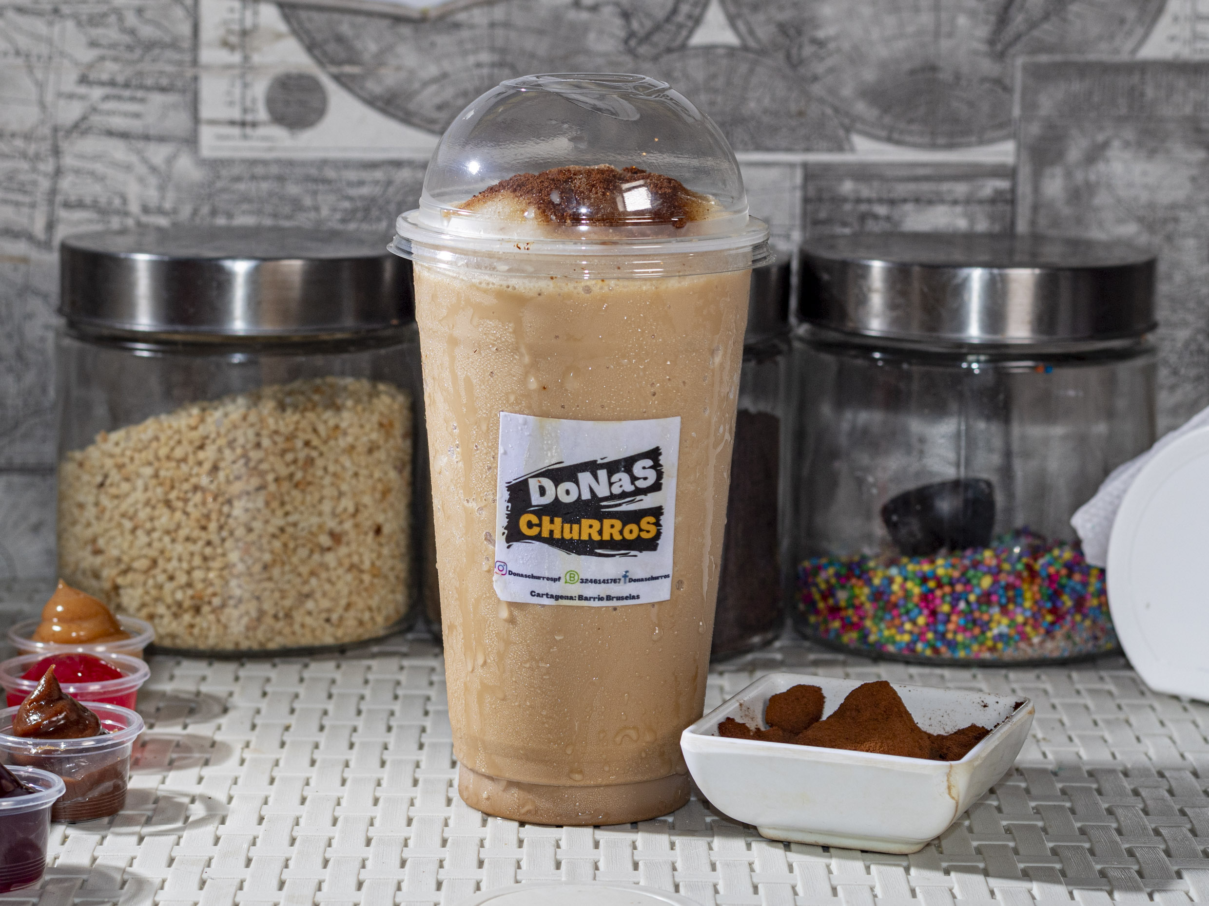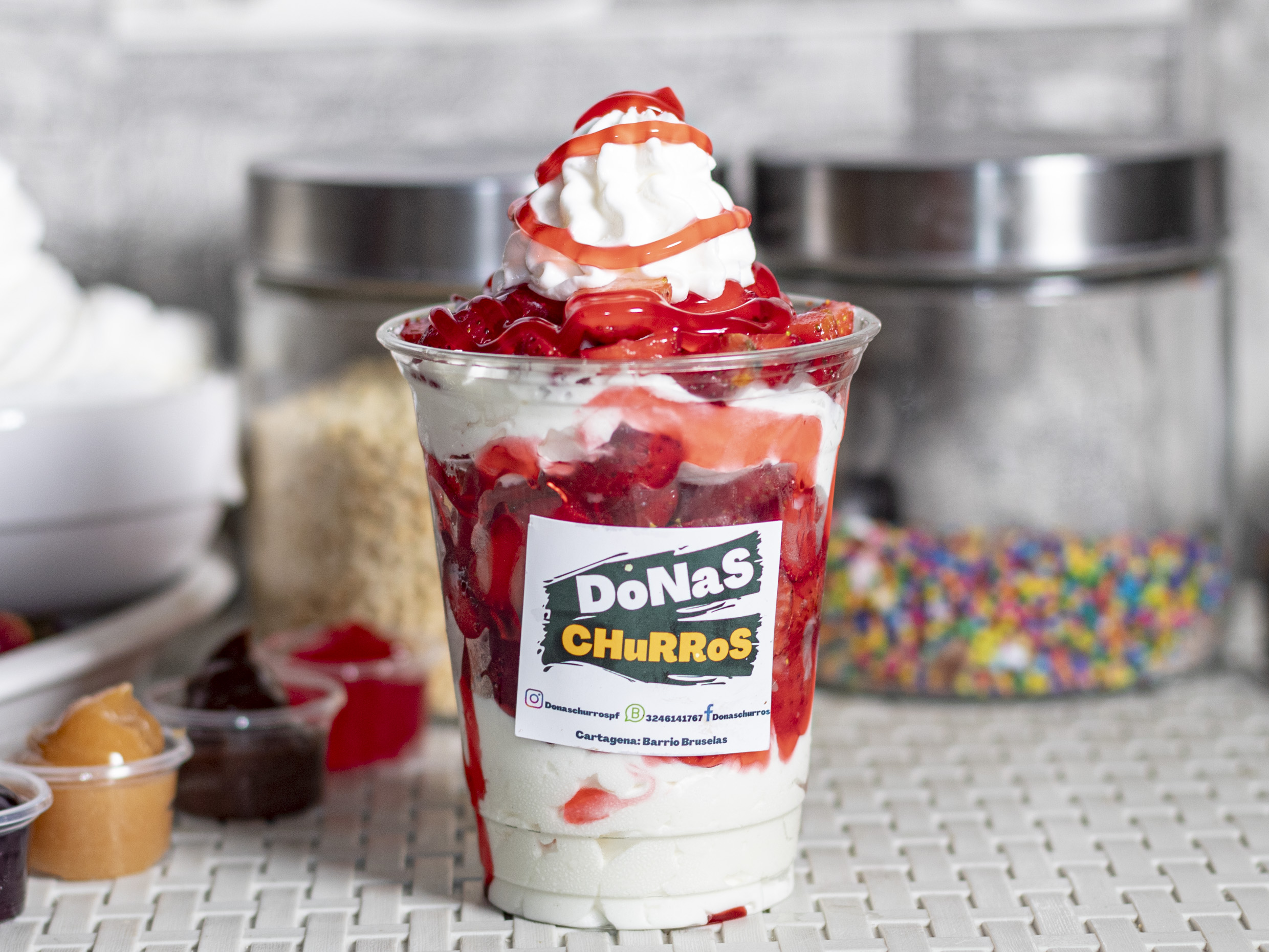1 fresas con crema 9 oz y 4 mini churros con topping de arequipe
