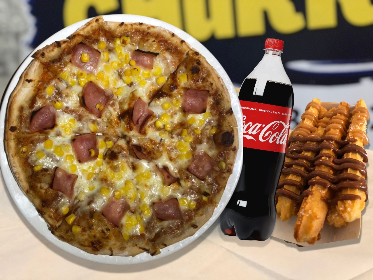 Masa cacera con un toque unico y suve, bañada en salsa napolitana de la casa, queso mozarela, trozoz de jamon y maiz tierno.