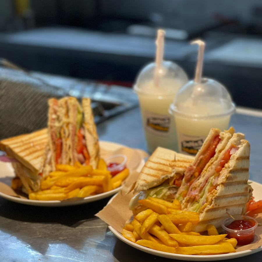 2 club house rellenos de pechuga de pollo, tocineta, jamon, queso, lechuga, tomate, cebolla y salsa de la casa + 2 porciones de papas y 2 frappe
