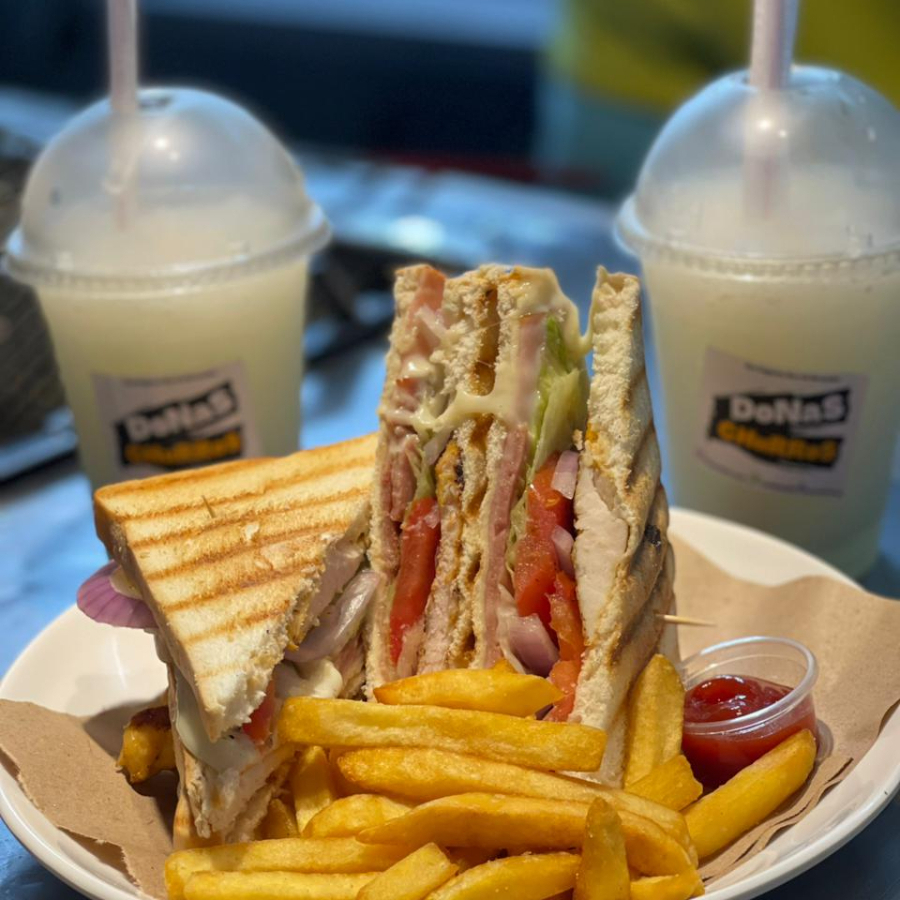 1 club house relleno de pollo, tocineta, jamon, queso, lechuga, tomate, cebolla, lechuga y salsa + 1 porcion de papas fritas y 1 frappe