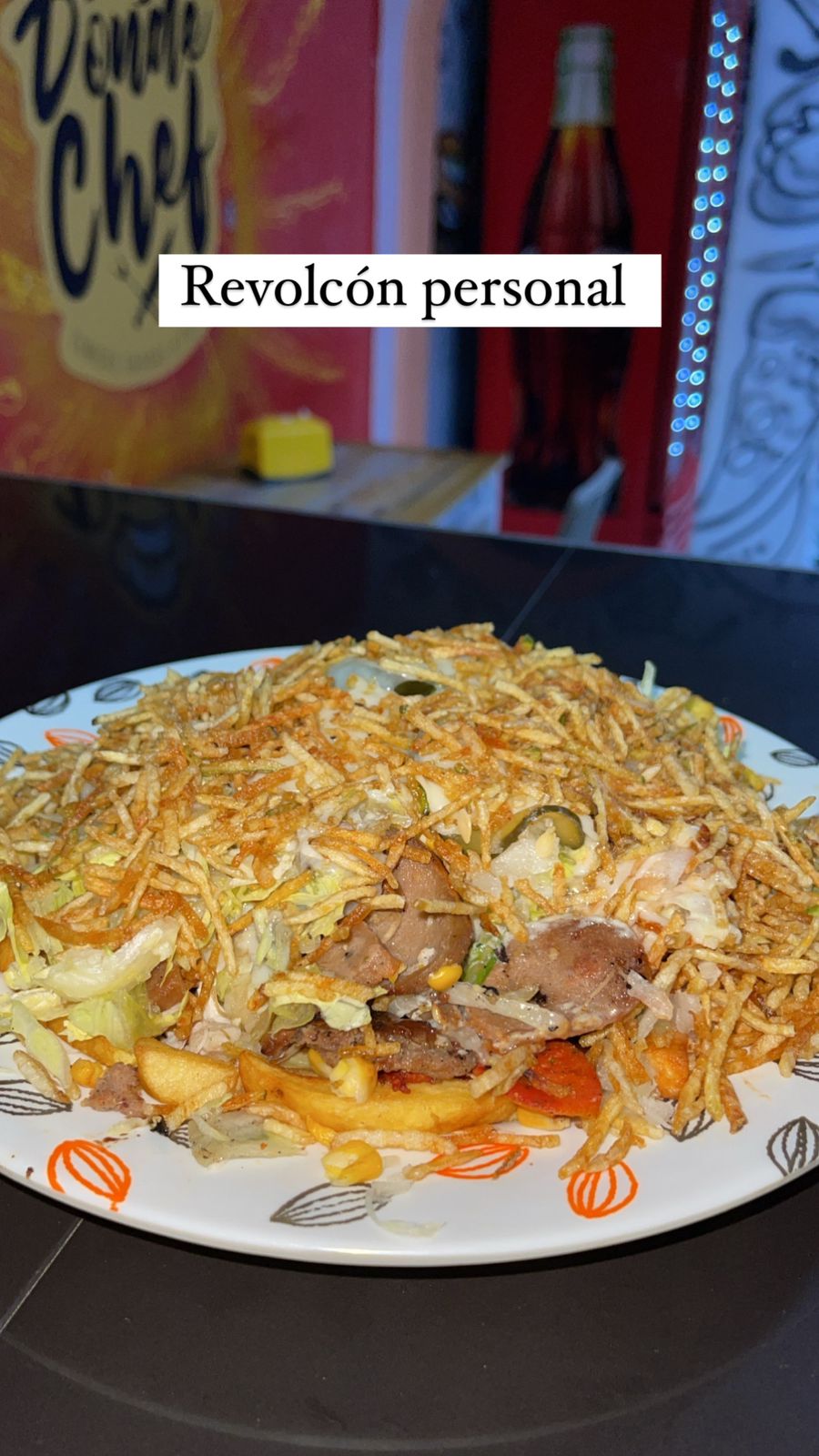 Patacón, papa francesa, maíz, doble capa de mozzarella, chorizo, butifarra, pollo, carne, tocineta, vegetales frescos.