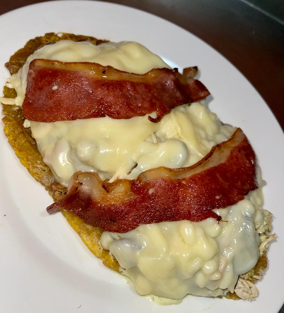 Patacón, doble capa de mozzarella, chorizo, butifarra, pollo, carne, tocineta, vegetales frescos.